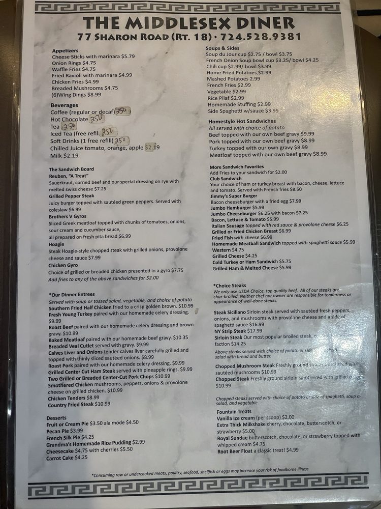 The Middlesex Diner, located at 3462 Sharon Rd West Middlesex, PA 16159, offers a classic diner experience with a variety of options for breakfast, lunch, dinner, and even late-night cravings. Customers rave about the all-day breakfast, with Lisa S. enjoying pancakes with bacon and Will R. appreciating the traditional menu offerings. The friendly staff, efficient service, and cozy atmosphere make it a great stop for a quick meal. While some find the decor a bit dated, the long history of the diner adds to its charm. Overall, patrons like Brian S. and Jose C. have consistently praised the food quality and welcoming environment, making Middlesex Diner a beloved spot in the community. With options for takeout, reservations, and delivery, this diner caters to various dining preferences, making it a versatile choice for all.